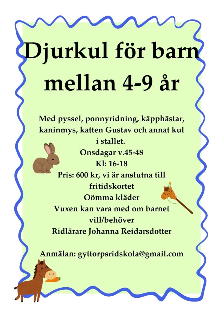 Djurkul med pyssel, ponnyridning, käpphästar, kaninmys och annat roligt i stallet.
