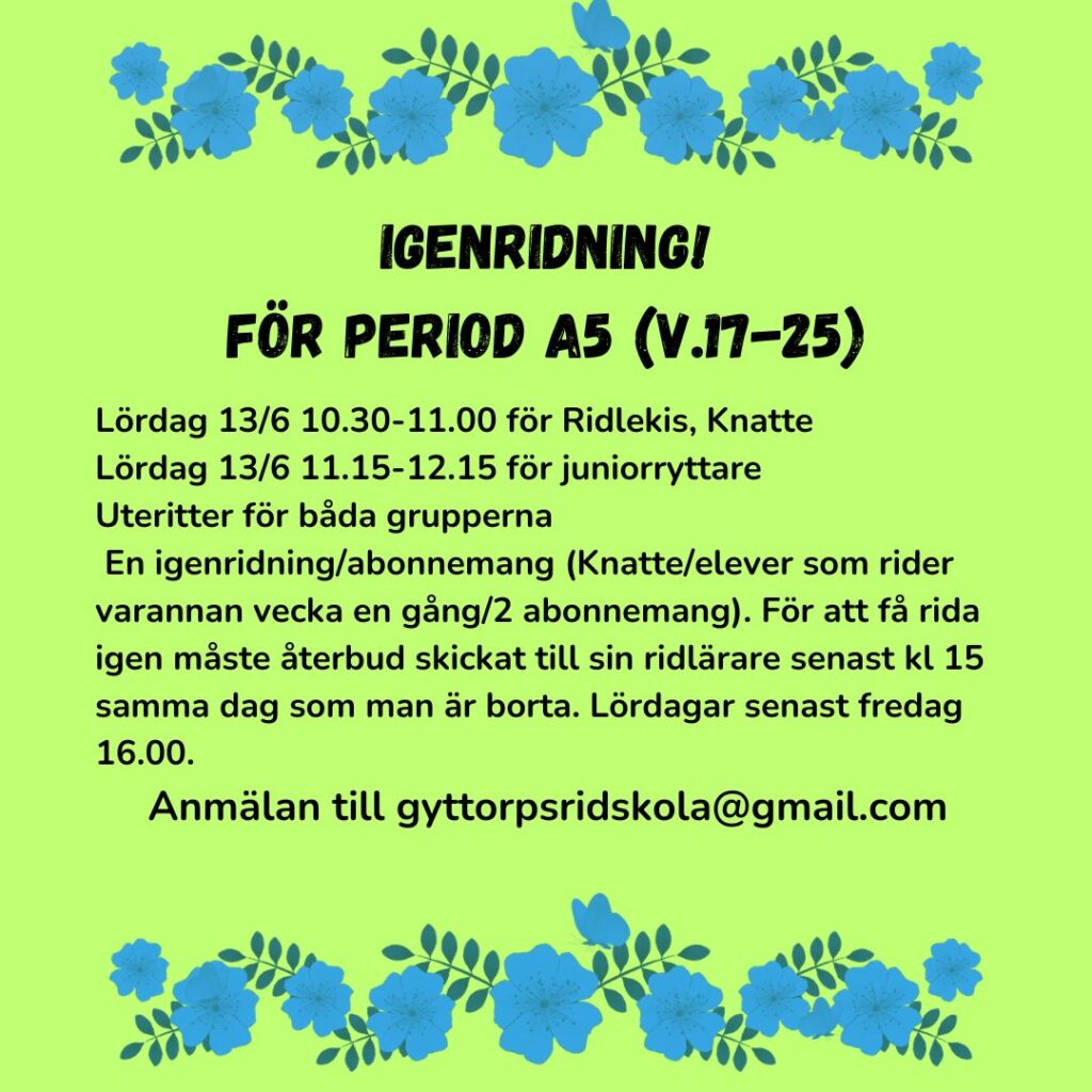 En igenridning/abonnemang (Knatte/elever som rider varannan vecka en gång/2 abonnemang). För att få rida igen måste återbud skickat till sin ridlärare senast kl 15 samma dag som man är borta. Lördagar senast fredag 16.00.