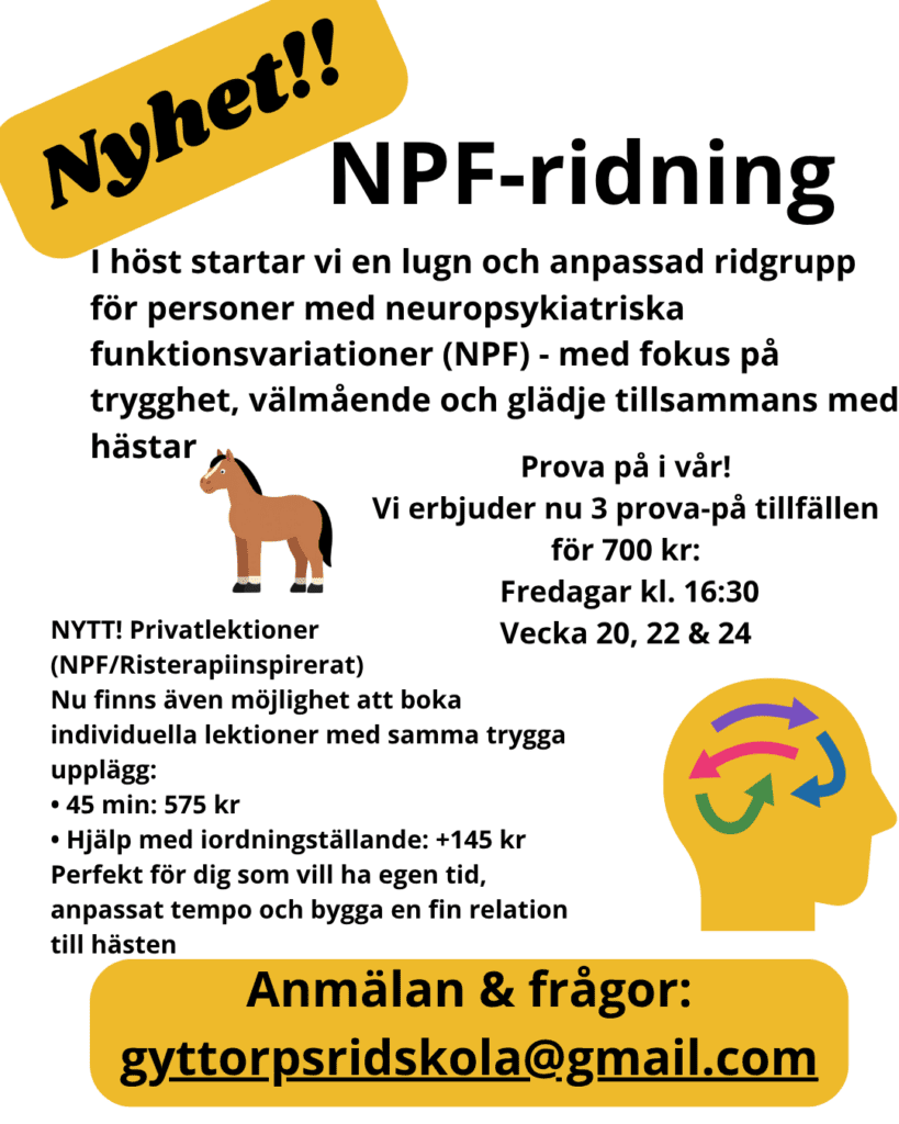 I höst startar vi en lugn och anpassad ridgrupp för personer med neuropsykiatriska funktionsvariationer (NPF) – med fokus på trygghet, välmående och glädje tillsammans med hästar